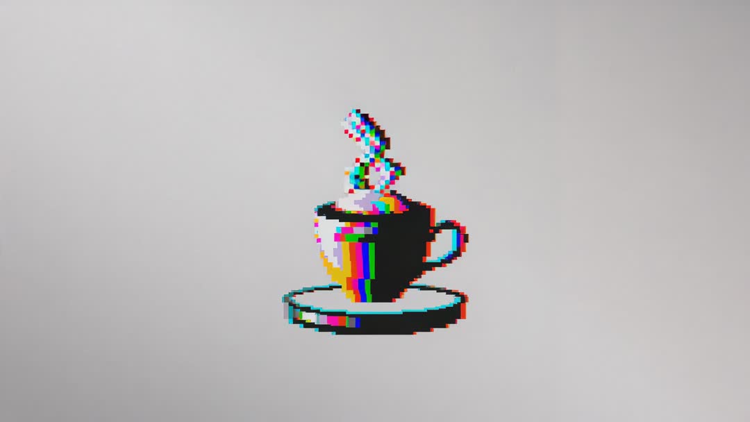 AI Generated Image. Looping video clip featuring pixelated coffee cup and saucer performing RGB split glitch on gray background. Showing jittering steam rising in blocky 8-bit style while saturated color channels create red, green, blue offsets. Offering seamless loop suitable for short social clips, animated avatars, streaming overlays, website headers, app icons, and retro branding. Enhancing tech blog posts, cafe marketing with playful digital twist, video intros, presentation slides, and NFT galleries. Working well in square or vertical crops; recommending export as MP4 or GIF for web. Allowing color grading or overlaying text without losing focal contrast, and pairing naturally with bold typography or neon color palettes for eye-catching motion design.