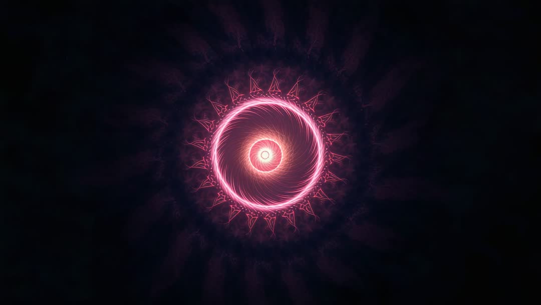 AI Generated Image. Looping abstract animation presenting pulsing neon mandala rotating around luminous core, torus ring spiraling inward while spikes radiating outward. Central core glowing with concentric spiral layers, producing hypnotic vortex and kaleidoscopic symmetry. Color palette leaning toward magenta and pink on deep near-black background, producing high contrast neon glow. Ideal for use as background loop for electronic music visualizers, VJ sets, title sequences, meditation and wellness apps, futuristic brand promos. Clip working well for thumbnail art, social media reels, website hero loops, album cover animations, and motion backgrounds in presentation slides. Editing tips: speed ramping accentuating pulse, color grading shifting mood toward warm or cool tones, radial blur and additive blend modes enhancing glow. Source generated with fractal and generative algorithms, suitable for sci-fi, tech, abstract, spiritual, or psychedelic projects.