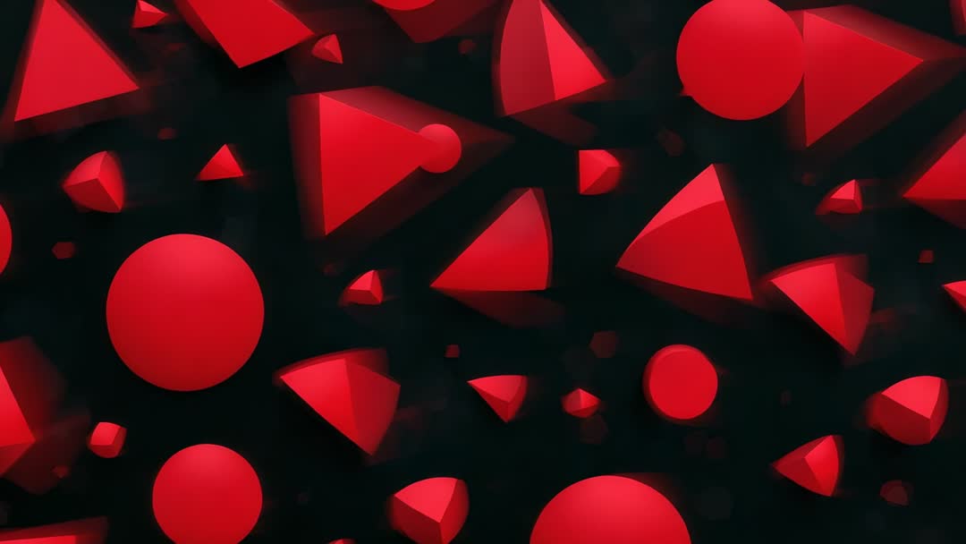 AI Generated Image. Looping video showing red spheres and pyramid shapes rotating and drifting through dark void, casting soft red glow and subtle motion blur. High contrast composition creating depth and sense of weight as shapes float toward and away from viewer. Smooth seamless loop suitable for background playback on websites, music visualizers, product promos, corporate presentations, social media headers, and live VJ sets. Color palette dominated by deep black and vivid red, offering strong graphic impact and easy color grading. Works well as hero loop for landing pages, ambient backdrop for events, overlay for title sequences, or repeating clip for digital signage. Provided in 16:9 4K format with optional alpha channel for easy compositing and speed ramping. Loop length approximately 8 seconds, seamless repetition for continuous playback. Ideal for designers and video editors seeking modern abstract motion elements and futuristic atmosphere.