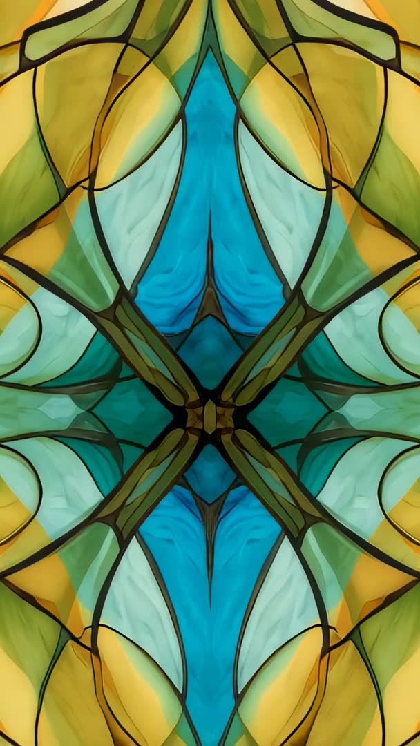 AI Generated Image. Providing looping stained-glass kaleidoscope motion tailored for vertical displays. Creating seamless decorative background for social media stories, reels, mobile ads, and UI hero sections. Enhancing VJ sets, live visuals, and projection mapping with rhythmic symmetry and rich cyan-golden palette. Serving as meditative visual for wellness apps, spas, and relaxation videos. Supporting title sequences, transitions, and brand bumpers by layering subtle parallax and overlay text. Recommending 30-60 second loops, subtle speed ramping, and color grading to match brand identity. Exporting at 9:16 aspect ratio and high bitrate for crisp stained-glass detail.