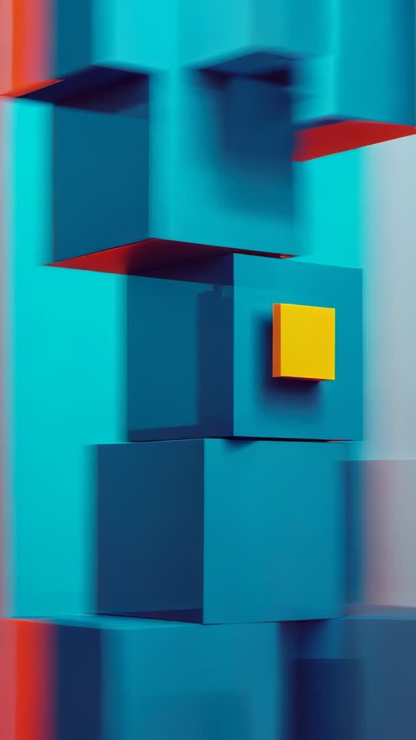 AI Generated Image. Vertical looping video showing teal cube column rotating in blue environment while single yellow cube keeping front face. Geometric abstract modern minimalistic composition featuring strong color contrast and subtle motion blur, creating rhythmic visual pulse. Working well for background usage in mobile apps, vertical social ads, Instagram Reels, TikTok campaigns, product promos, motion graphic loops, UI hero animations, technology website headers, digital art installations, gallery displays. Composition leaving central-right area for logotype or text overlay, yellow face providing natural anchor for brand mark. Export recommendations using looping MP4 or GIF, 9:16 aspect ratio, high frame rate for smooth motion, optional color grading to enhance teal and yellow tones.