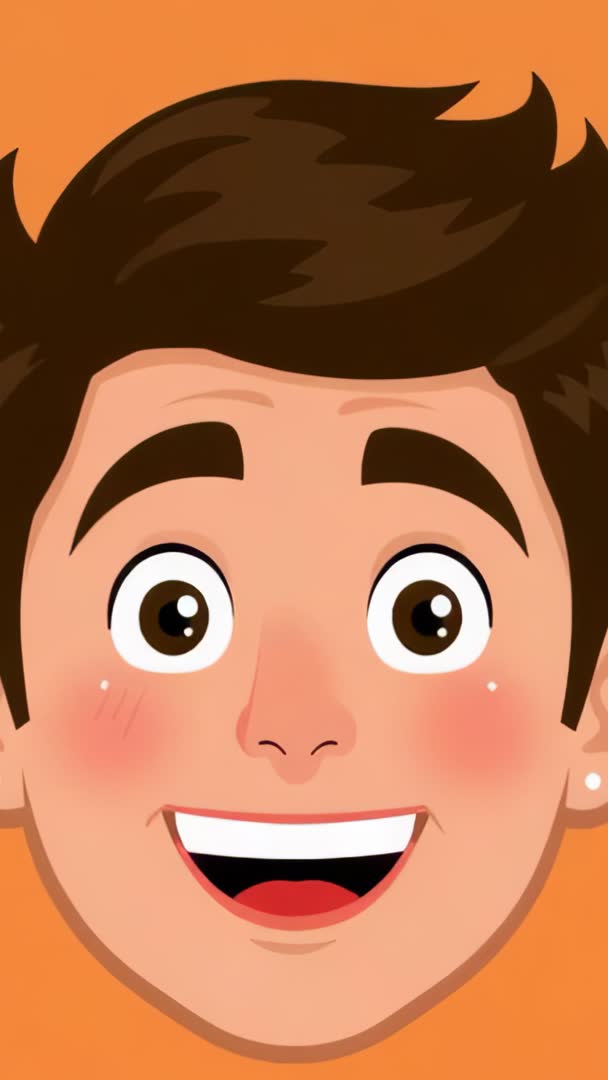 AI Generated Image. Featuring looping vertical animation presenting cheerful cartoon male face with wide smile, sparkling eyes, rosy cheeks, and bold hair silhouette on vibrant orange background. Rendering vector illustration, scalable without quality loss, optimizing for vertical 9:16 delivery. Offering smooth seamless loop, perfect for short social media stories and mobile ad placements. Suiting app intros, brand mascots, animated avatars, sticker packs, children's content, onboarding sequences, greeting messages, thumbnail animation. Allowing easy customization of colors, mouth movement, eye-blink timing, background hue, and addition of text overlays or logo. Providing fast export to MP4, GIF, or Lottie for web and mobile. Using for boosting brand friendliness, increasing viewer engagement, and conveying joyful emotion in short-form content.