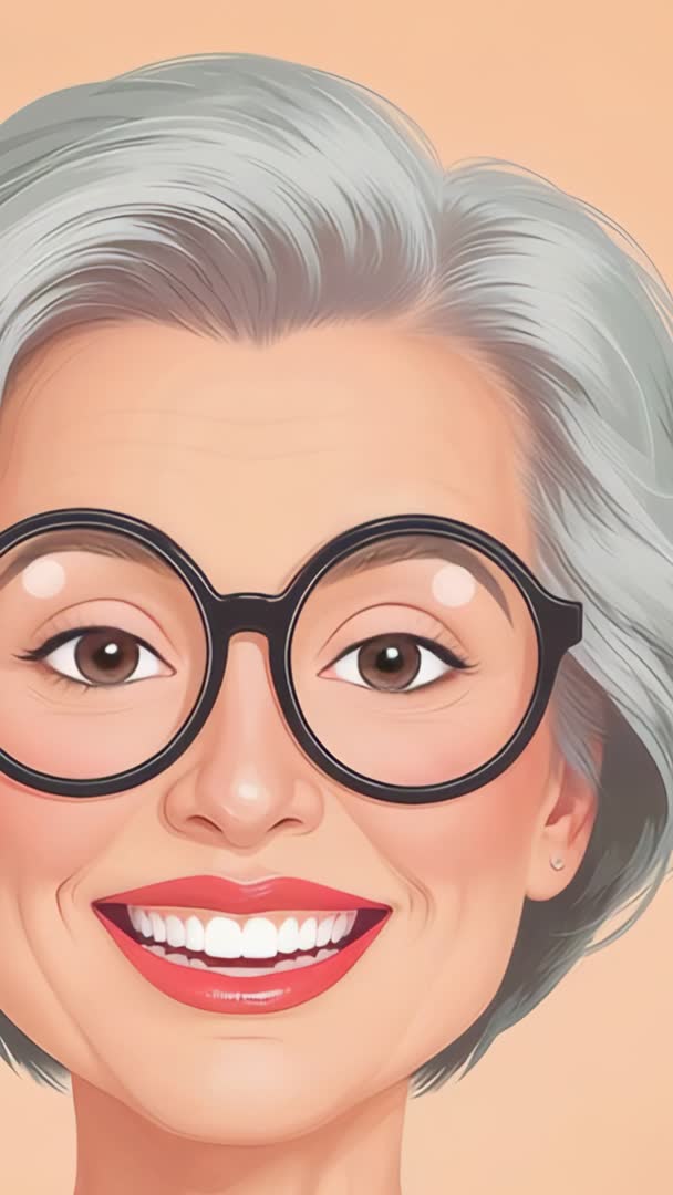 AI Generated Image. Looping vertical clip showing smiling senior woman blinking against soft peach background. Close-up portrait featuring silver hair, round black glasses, stud earrings, and radiant smile. Animated character design with clean minimal style and natural skin tones. Ideal for social media reels, Instagram Stories, TikTok ads, mobile-first campaigns, and app onboarding. Useful for wellness and vitality topics, dental and vision care promotions, retirement lifestyle content, health and beauty branding, senior-friendly service pages, and friendly customer communications. Easy to loop for seamless display as hero banner, thumbnail, profile header, animated sticker, or email hero. Pairing with short captions, subtle music, and bold text overlays to emphasize messaging and call to action.