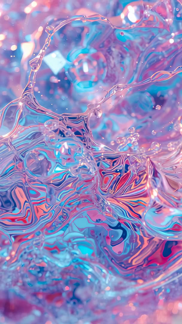 AI Generated Image. Featuring looping vertical fluid simulation with undulating, refracting holographic pastel forms moving across frame. Flowing organic shapes refracting cyan and pink light, creating iridescent, shimmering textures and soft bokeh highlights. Working as seamless vertical loop for phone screens, social stories, and animated backgrounds. Suggesting use for music visualizers, VJ sets, fashion and beauty promos, tech brand openers, app splash screens, and ambient relaxation visuals. Providing options for overlaying text or logos, color grading to brand palette, and speed adjustment to match soundtracks. Pairing well with minimal typography and subtle motion blur for immersive, dreamy aesthetic.