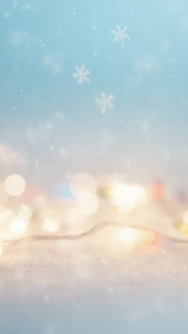 AI Generated Video. Showing looping vertical holiday clip with warm bokeh lights glowing on snowy tabletop and delicate snowflakes drifting across soft blue gradient. Foreground featuring soft-focus warm string lights creating cozy glow and subtle frost texture on surface. Background featuring gentle bokeh circles and floating snow for calming festive mood. Use cases: perfect for mobile story backgrounds, social media reels, digital greeting cards, seasonal ads, countdown overlays, retail display loops, event intros. Loop is seamless for continuous playback during retail displays or livestreams. Compatible with overlaying text, logos, animated greetings, countdown timers, or promotional graphics. Color grade options: cool blue base with warm highlights for pleasing contrast. Duration and loop settings adjustable for different platforms and aspect ratio needs.