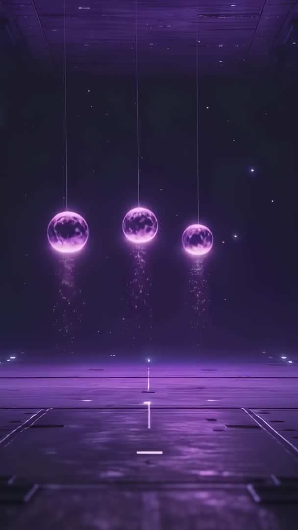 AI Generated Video. Showing three glowing purple spheres floating and shifting into linear formation inside futuristic sci-fi chamber. Particles trailing from orbs creating sparkling stream and subtle glow, reflective floor mirroring neon accents to add depth. Mood leaning toward cyberpunk, ambient, hypnotic atmosphere suiting electronic music and tech projects. Ideal for mobile background loops, Instagram Stories, TikTok ads, VJ loops, stage projection, music visualizers, streaming intros, gaming channel branding. Supporting vertical 9:16 aspect ratio and seamless looping for continuous playback and easy trimming. Allowing color grading, blending modes, and overlay compositing for custom branding, title sequences, or layered motion graphics.