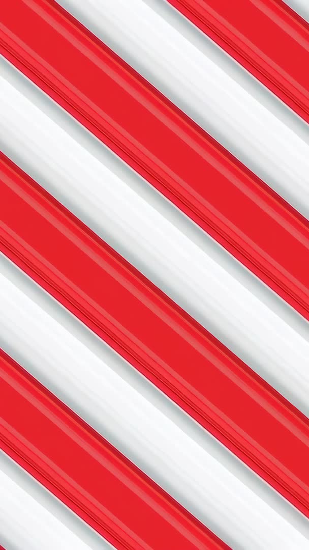 AI Generated Video. Looping vertical clip presenting glossy red and white diagonal stripes with pronounced ridges, soft shadowing, and subtle highlights that create depth and rhythmic motion. Working well for social media reels, mobile backgrounds, animated banners, and title cards. Serving as bold backdrop for product reveal, holiday campaign, retail signage, or modern branding. Looping seamlessly in 9:16 orientation, providing tileable repeat and striking visual contrast. Editing tips: overlaying text in neutral color, adding slow parallax or color shift to enhance motion, cropping for alternate aspect ratios while maintaining pattern flow.
