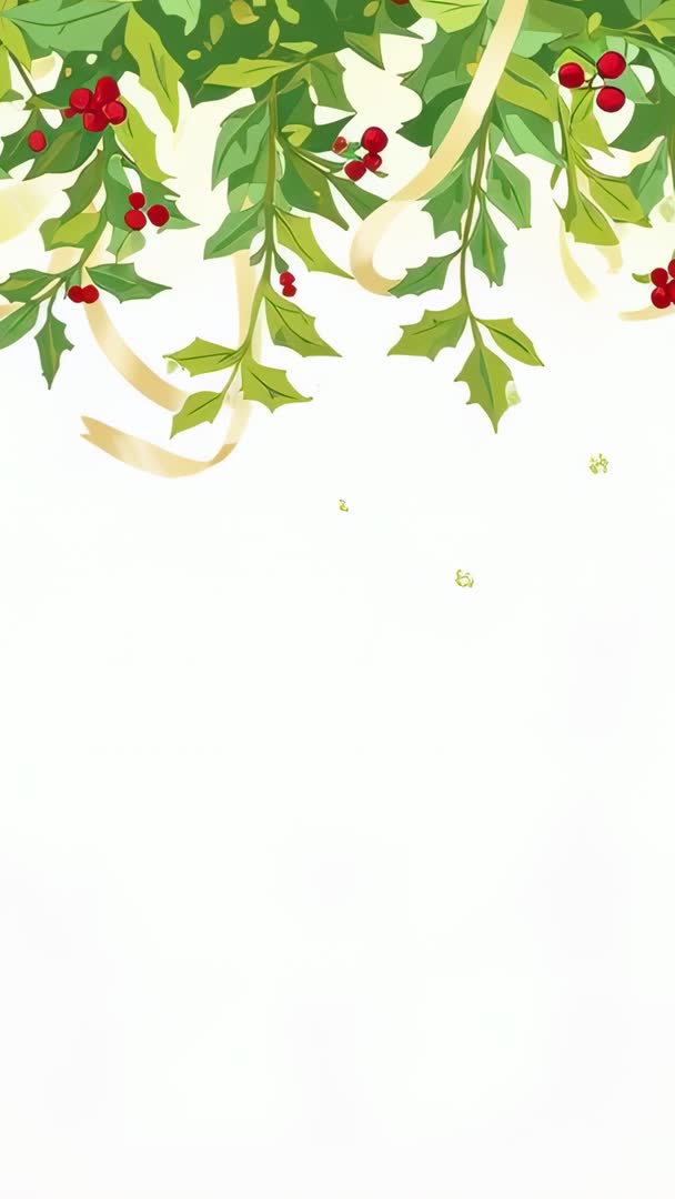 AI Generated Video. Looping vertical clip featuring swaying holly garland with glossy red berries and curling gold ribbon over soft cream backdrop. Gentle leafy branches and drifting berry petals creating calming continuous motion, leaving ample lower copy space for text or logos. Color palette balancing festive green and red with refined gold accents, delivering warm holiday mood. Optimizing for seamless looping and mobile-first vertical playback. Suggested uses include working for social stories and reels, mobile greeting cards, email headers, website hero banners, retail window displays, digital invitations, seasonal promos, event intros, and printable greeting backgrounds.