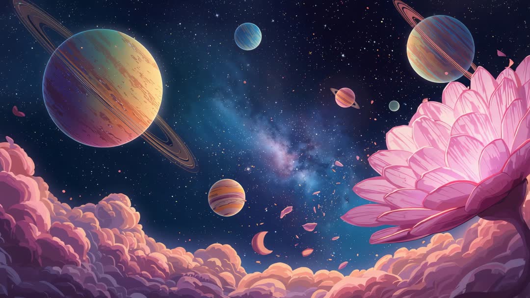 AI Generated Image. This animation showcases a vast cosmic scene where an ethereal lotus flower gently drifts amidst a sky filled with giant gas planets and stars. Perfect for projects involving fantasy themes or celestial storytelling. The surreal liquid-style colors contribute to a wonder and magic surround, ideal for creative or meditative visuals, backgrounds, or illustrative presentations capturing dreamy atmospheres and eternal visions.