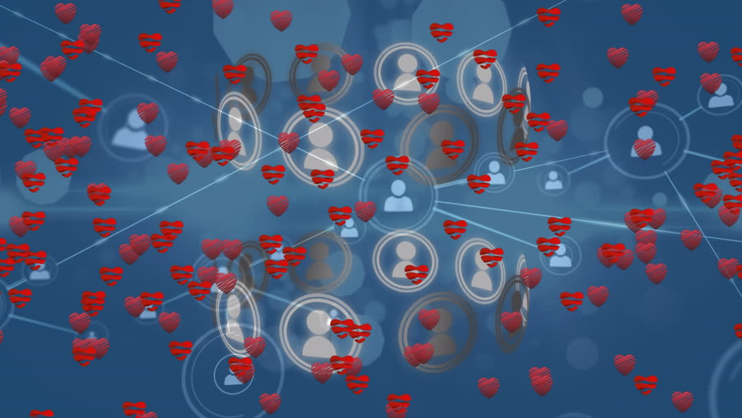 Animation of red hearts mixed with a network of connected people icons signifies blend of love and technology. Ideal for depicting themes about digital relationships, social networking, or the integration of emotions in global digital platforms. Can be used in wedding tech services, social media campaigns, or multimedia storytelling focusing on connectivity and affection.
