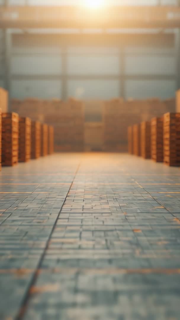 AI Generated Image. Footage following low-angle dolly along textured warehouse floor toward loading door, revealing rows of stacked wooden pallets bathed in warm sunlight and creating strong sense of depth. Vertical framing and shallow depth of field delivering cinematic mobile-friendly clip ideal for short-form platforms. Fitting opener for logistics corporate video, warehouse tour, supply chain explainer, ecommerce fulfillment ad, industrial safety training, and social media reels. Providing smooth forward motion and warm color palette for transitions, lower third backgrounds, title reveal, and stock footage libraries. Optimized for vertical formats such as Instagram Reels, TikTok, Snapchat, mobile ads, and app backgrounds.