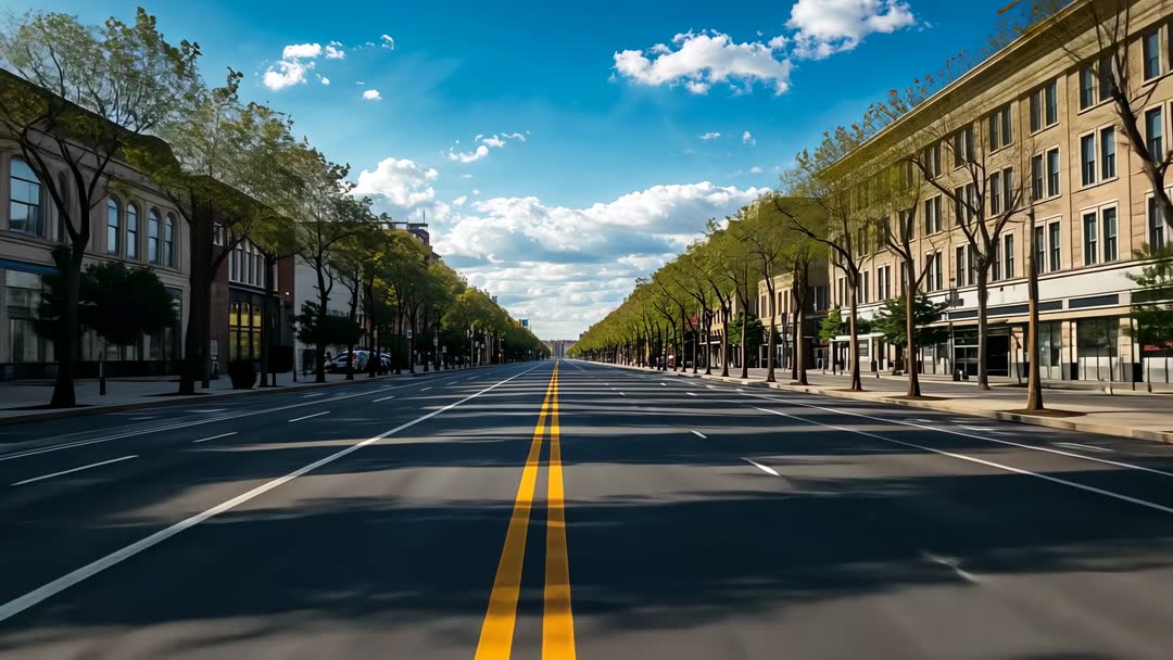 AI Generated Image. Gliding low-angle forward along empty tree-lined boulevard, revealing double yellow centerlines and strong vanishing point. Warm daylight casting long shadows across smooth asphalt, blue sky with scattered clouds adding visual depth. Footage working well as cinematic background, hero header, website banner, travel promo, architectural showcase, traffic safety or urban planning presentation. Suitable for looping and layering under title cards, lower thirds or motion graphics. Color grading suggestions: boosting contrast and warmth to enhance midday light and adding subtle film grain for cinematic feel. Recommended use cases: news openers, corporate videos, social media reels, documentary sequences, transition shots and virtual tour introductions. Wide framing and steady gimbal movement providing ample negative space for on-screen text and branding.