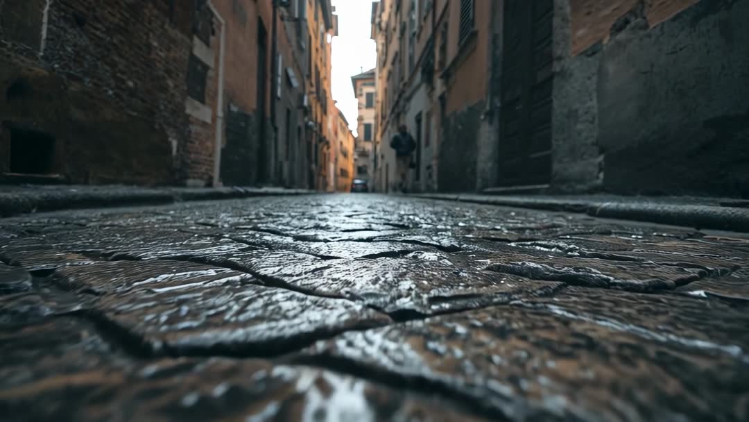 AI Generated Image. Footage showing low-angle pullback across wet cobblestone, revealing narrow historic alley and solitary walker wearing dark coat. Foreground reflecting overcast sky and streetlights, creating textured glossy surface and strong leading lines toward vanishing point. Mood conveying cinematic, moody atmosphere suitable for travel promos, tourism videos, urban lifestyle commercials, historical documentaries, and title sequence openers. Clip working well as establishing shot, B-roll, background for text overlays, social media reels, website hero banner, and atmospheric interstitial in longer edits. Technical notes: framed for 16:9, shallow depth of field emphasizing foreground texture, slow-motion playback enhancing smooth motion, color grading favoring cool tones with subtle warmth on architecture to boost depth. Usage tips: pair with ambient street sound or minimal piano for introspective tone, use as transition into city scenes or as visual hook for travel storytelling.
