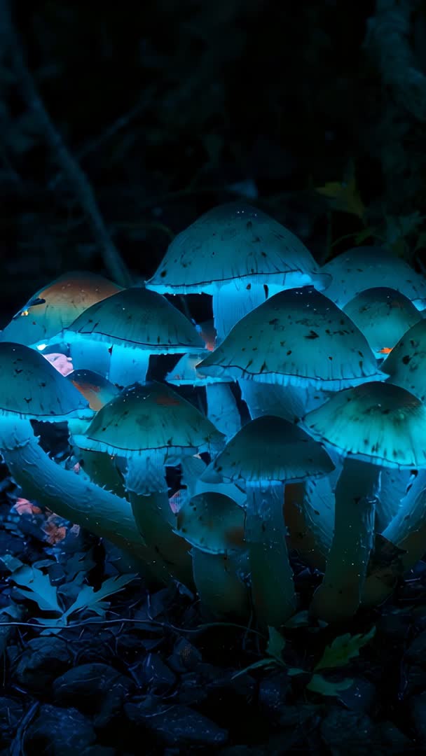 AI Generated Image. Low-angle vertical footage showing cluster of bioluminescent mushrooms emitting cyan light and revealing delicate gill edges. Nighttime, damp forest floor mood creating ethereal glow and strong contrast against dark underbrush. Close-up movement guiding viewer across caps and stems, highlighting texture and soft bioluminescent shimmer. Working well for nature documentaries, science explainer videos, environmental and mycology content, social media reels, ambient backgrounds, app wallpapers, and title opener sequences. Including metadata notes: vertical orientation, low-light capture, natural cyan color palette, slow reveal movement perfect for color grading and cinematic slow-motion edits.