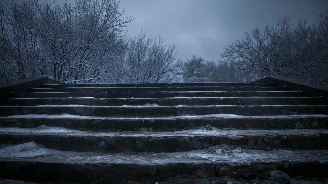 AI Generated Video. Low-angle video footage showing stone staircase leading upward through thin snow and icy steps, framed by bare winter trees under overcast sky. Evoking moody, cold, quiet atmosphere with subtle hint of abandonment and cinematic tension. Working well as moody B-roll, creating opening sequence for thriller or drama, providing establishing shot for winter landscape segments, and supporting seasonal marketing or travel content. Serving as background loop for websites and social channels, offering title card backdrops, and supporting overlay with ambient wind or distant footsteps for immersive sound design. Editing suggestions: applying slow upward pan, adding cool blue color grade, increasing contrast to emphasize stone texture, and extending clip for seamless loop.
