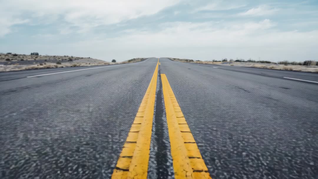 AI Generated Image. Low-angle tracking video following double yellow centerline across long desert highway. Camera advancing along asphalt surface, revealing paint chips, worn texture, subtle rumble strips and distant horizon. Wide composition creating strong vanishing point and open-road feeling, cloudy sky adding moody atmosphere. Use for travel promotions, road trip films, automotive commercials, background for title sequences, web banners, editorial features about infrastructure, solitude and journey. Edit-friendly framing allowing text overlay on sky or road shoulder, safe negative space for logos and headlines. Color grading suggestions include cool desaturation for moody look or warm tones for sunset conversion. Suitable for commercial and editorial licensing, digital ads, social media reels and cinematic montage sequences.