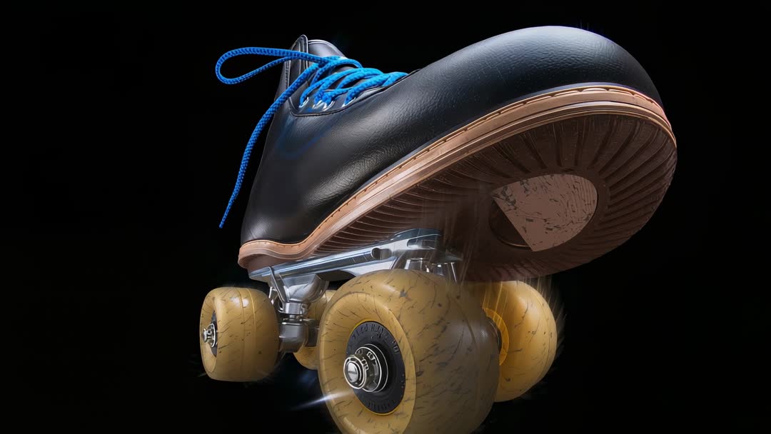 AI Generated Image. Video showing low-angle closeup of quad skate rotating on black background. Leather boot with blue laces, tan urethane wheels, chrome hubs, and aluminum truck appearing in crisp detail while wheels blurring from rotation. Studio lighting creating dramatic reflections on leather and metal, highlighting textured sole and wheel wear for authentic look. Working well for product commercial, online store hero clips, social media advertising, in-store displays, and lifestyle editorial promoting retro skating culture. Providing room for overlay text, logo animation, closeup transitions, and slow-motion cutaways for wheel and bearing demonstration; suitable for 4K banner, hero reel, and promotional spots.