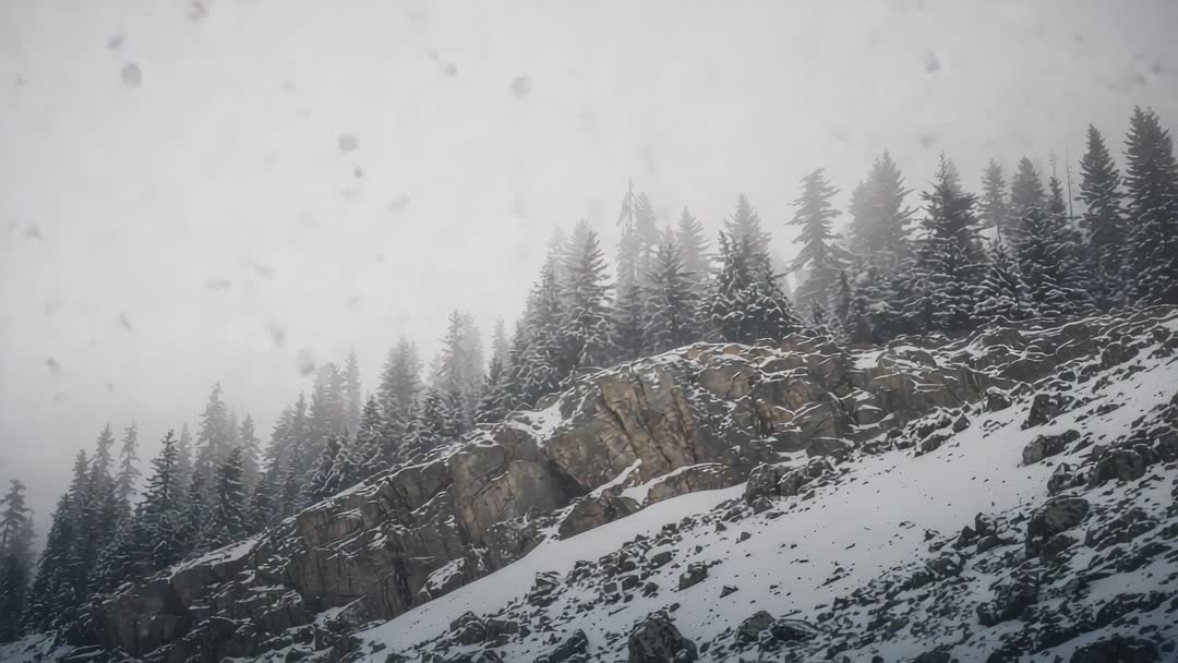 AI Generated Video. Footage showing heavy snowfall drifting through low cloud and fog over rocky alpine ridge lined with snow-capped conifers. Composition featuring diagonal slope of talus and exposed cliff with tall pine silhouettes fading into mist. Close foreground snowflakes creating soft bokeh and strong sense of depth. Palette featuring muted grays and cool blues with crisp contrast on rock faces and soft texture of fresh snow. Use for winter travel safety messaging, outdoor adventure promotions, climate impact stories, atmospheric website backgrounds, or broadcast weather segments. Suitable for title sequences, nature documentaries, conservation campaigns, and winter tourism promos. Clip working well as full-frame background, parallax layer, or establishing shot for film and video projects. Providing slow-motion and loopable options for meditative ambient visuals and social media reels. Suggested edits: color grading for moody tones, adding subtle ambient sound design or wind for immersive impact.