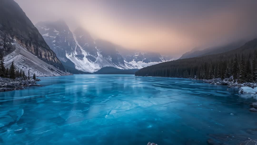 AI Generated Video. Footage showing low clouds brightening over frozen teal alpine lake framed by snow-covered peaks and dense conifer forest along shoreline. Cracked ice patterns and glassy reflections creating dramatic foreground while mist and warm glow along horizon adding cinematic contrast. Slow pan and subtle camera movement revealing scale of mountain valley and tranquil winter atmosphere. Useful for travel videos, environmental documentaries, meditation and relaxation backgrounds, commercial ads, website hero headers, seasonal greeting clips, and social media reels. Editable color grading and speed allowing seamless integration into scenic montages and atmospheric storytelling. Licensable for broadcast, corporate, editorial, and lifestyle projects.