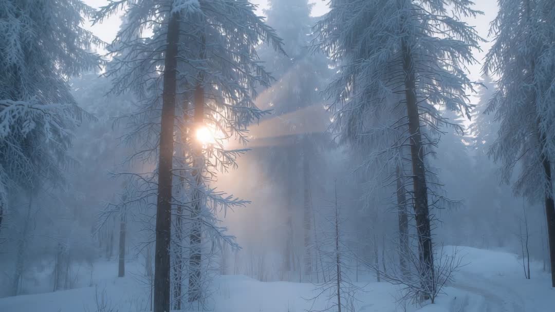 AI Generated Video. Showing low sun piercing frosted conifer stand, creating crepuscular rays through dense mist and illuminating snow-covered path. Capturing quiet, cold mood with soft blue tones and warm sunlight contrast, offering cinematic winter atmosphere for storytelling. Serving as loopable ambient footage for relaxation backgrounds, opening or establishing shot for films and commercials, overlaying title text for seasonal campaigns. Recommending slow-motion playback and subtle color grading to enhance warm-cool contrast, adding soft ambient music for calming effect, using 4K delivery for large-screen projects. Working well at 10-30 second durations and loop-friendly for longer ambient sequences. Suitable for editorial use in nature and climate stories, and for commercial use in travel, wellness, holiday promotions and website hero banners.