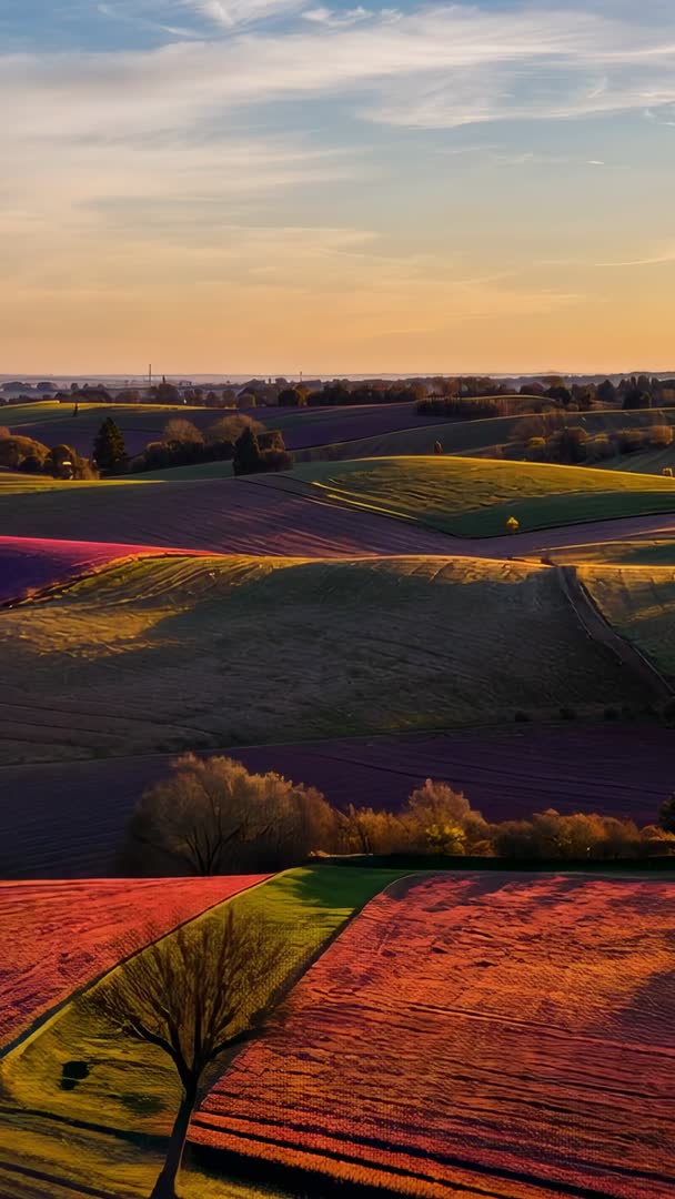 AI Generated Image. Video showing lowering drone revealing colorful rolling farmland at golden hour, focusing solitary deciduous tree standing along curved hedgerow. Warm sunset light casting long shadows across textured crop rows, creating layered bands of color and depth. Smooth vertical framing allowing use for social media reels, mobile backgrounds, cinematic openers. Ideal for travel and agriculture storytelling, environmental features, seasonal marketing, real estate presentations, meditation or relaxation content. Editing suggestions: add gentle ambient music, slow crossfade cuts, text overlays for title cards, color grade to enhance warm tones and accentuate field patterns.