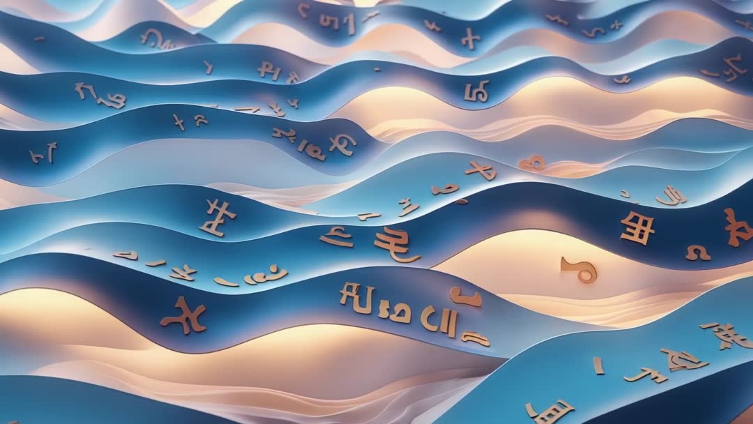 AI Generated Image. This video captures an arrangement of blue, flowing waves with golden symbols interspersed throughout, generating a lively kinetic pattern. Suitable for digital art platforms, technology thematic presentations, advertisements centered around AI innovations, and creative design projects needing a futuristic aesthetic appeal.