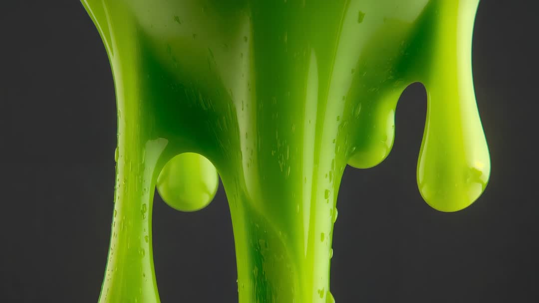 AI Generated Video. Luminous green liquid gracefully dripping while demonstrating fluidity and elasticity contrasts starkly against dark backdrop for artistic representation; use for abstract art themes, fluid dynamics illustrations, decor inspiration, nature documentaries examining viscosity effects, engaging marketing materials capturing attention.