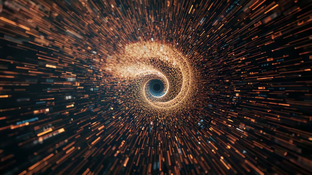 AI Generated Image. Showing luminous spiral vortex tightening toward central aperture while rectangular glyphs and glowing particles streaming outward, creating powerful sense of motion and depth. Ideal for tech presentations, AI and big data explainers, cybersecurity campaigns, product launch intros, broadcast bumpers, website hero loops, conference stage backdrops. Supporting looped playback and high-resolution 4K editing. Offering warm golden palette with teal accents for modern high-tech look. Suggesting use as title card background, lower third underlay, scene transition, visualizer element for electronic music, or stock footage for sci-fi trailers and startup demo reels.
