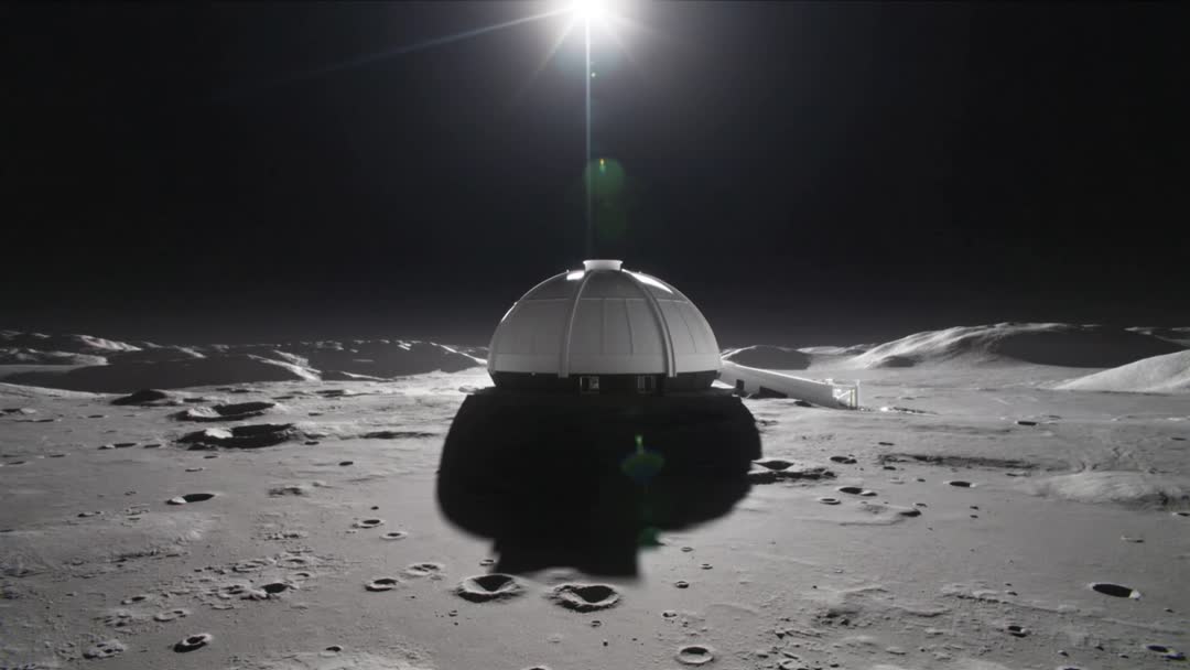 Lunar Dome Habitat Casting Long Shadow Across Cratered Plain Under Solar Flare Video
