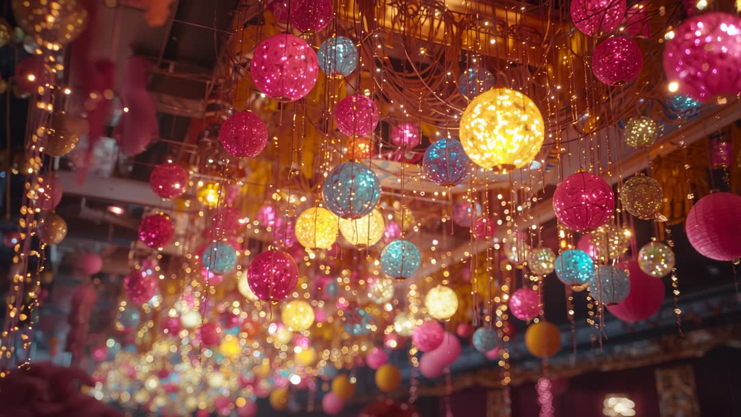 AI Generated Image. This illuminating scene captures assorted colorful lanterns entwined with beaded ribbons and twinkling lights hanging from a banquet hall ceiling. The play of lights lends an enchanting and festive atmosphere, perfect for showcasing luxury and celebration at large events. Ideal for travelogues focusing on extravagant celebrations, event planning themes, or designs for party decorations.