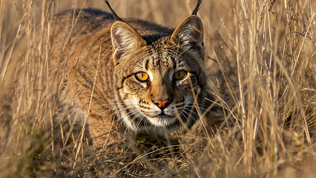 AI Generated Video. Close-up video showing lynx-like wildcat stalking through tall dry grass, focusing on ear tufts, whiskers, and intense amber eyes. Low-angle camera tracking animal moving silently toward off-frame target, blending with golden grass through natural camouflage and slow, deliberate motion. Warm golden-hour light accentuating amber tones and fine fur detail, featuring shallow depth of field and tight composition for dramatic wildlife storytelling. Use for nature documentary footage, wildlife conservation campaign, editorial on grassland predators, broadcaster stock library, outdoor brand commercial, educational video on feline behavior, social media short for wildlife channels, cinematic cut for film or commercial, museum or classroom exhibit on ecosystems, website hero banner or background. Technical notes: high-resolution frame, rich warm color palette, strong subject focus. Clip marked AI-generated when required by usage rights.