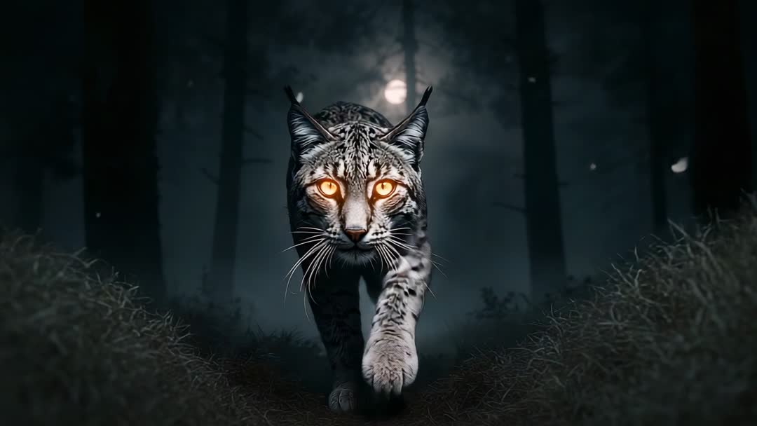 AI Generated Image. Dramatic close-up video capturing lynx stalking through moonlit forest fog, glowing amber eyes drawing viewer focus as paws advance toward camera. Backlit trees and full moon creating moody silhouette and deep shadow, with soft floating particles adding mysterious atmosphere. Composition centering on forward motion and eye contact, making footage ideal for slow-motion or speed-ramped sequences. Color grading options including cool desaturation for background and warm glow enhancement for eyes, heightening cinematic impact. Usage ideas: wildlife documentary openers, nature conservation campaigns, thriller or horror title sequences, social media short reels, museum displays, educational clips about nocturnal predators, promotional spots for eco-tourism, background footage for podcasts or music videos. Editing tips: applying subtle vignette, adding low-frequency rumble and distant owl or wind sound design, overlaying light rays to emphasize moonbeam. Footage presenting stylized realism for dramatic storytelling and visual marketing.