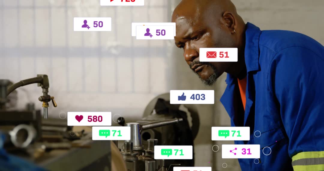 - Machinist at Work with Digital Distractions Represented by Media Icons