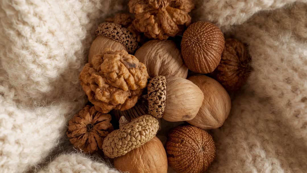 AI Generated Image. Showing macro camera tightening on cluster of seed pods and acorns resting on cream knit blanket, revealing intricate grooves, acorn caps, and fibrous knit texture. Warm soft lighting and shallow depth of field creating gentle bokeh and cozy mood. Neutral brown and cream palette supporting autumn, rustic, and natural decor themes. Useful for seasonal video openers, home decor product backgrounds, craft tutorial B-roll, social media reels, and blog headers; serving as texture overlay or calm transition clip in lifestyle and interior design projects. Looping well for calming background motion in greeting cards, packaging promos, and product showcase reels.