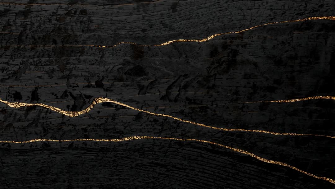AI Generated Image. Macro cinematic clip showing dark textured marble slab with three irregular gold veins running horizontally, lamp movement creating shimmering glints and warm reflections. Moody, elegant, high-contrast visual conveying luxury and craftsmanship. Use for background in product promos, title screens, website hero banners, social media reels, packaging mockups, interior design mood boards, VJ loops and event visuals. Overlaying text and logos on darker areas for clear legibility. Loop-friendly composition working for seamless motion backgrounds in presentations, adverts and brand films. Color palette featuring deep black, charcoal gray and warm gold highlights; texture providing tactile, handcrafted feel that is ideal for jewelry, cosmetics, premium tech and finance branding.