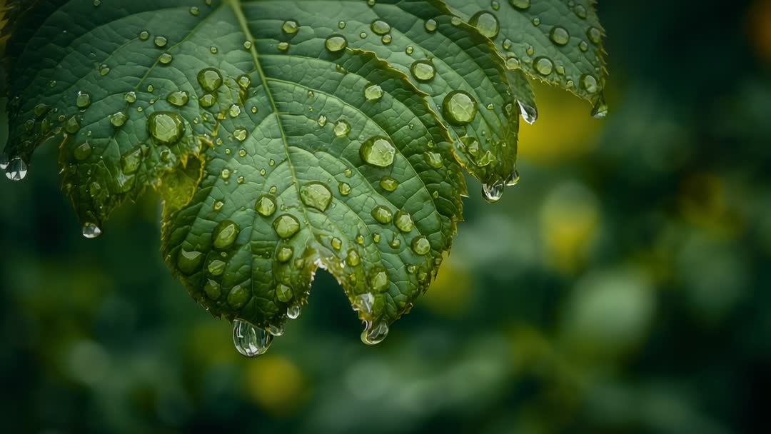 AI Generated Image. Showing extreme closeup macro footage of rain droplets forming and dripping from serrated green leaf against soft bokeh background. Capturing leaf vein texture, water bead reflections, and elongated droplets hanging from leaf edge. Highlighting natural color contrast between deep green foliage and warm blurred highlights. Suiting use for loopable nature clips, social media reels, website hero backgrounds, mindfulness or relaxation videos, gardening and horticulture tutorials, environmental campaign spots, and product ads for eco brands. Allowing easy edits such as vertical crop for smartphone reels, slow-motion playback for dramatic effect, color grading for cinematic mood, and overlaying text or logo. Providing clean negative space for headline placement and seamless looping for ambient displays.
