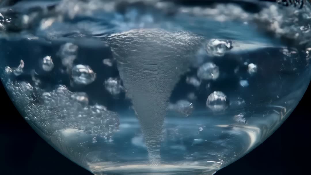 AI Generated Video. Showing macro closeup of bubbling vortex forming inside stemware as effervescent tablet dissolving and releasing streams of gas bubbles. Capturing fine bubble texture, central column swirl and shimmering light reflections for dramatic visual impact. Suited for beverage and cocktail advertising, sparkling water product promos, pharmaceutical and OTC dissolution demonstrations, science education and lab explainer videos. Working well as looping motion background for websites, social posts, title cards and motion graphics, or as illustrative clip for chemistry and formulation presentations. Suggesting slow-motion playback, cooler blue color grading, and close-crop framing to emphasize motion and texture while pairing with on-screen text for 'dissolve', 'effervescence', 'reaction' topics.