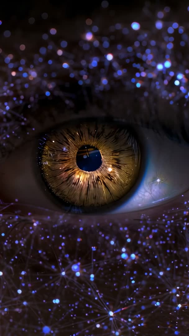 AI Generated Video. Featuring macro human eye holding steady gaze while violet-blue particle field drifting across foreground and background. Shot in vertical video format for mobile-first projects and social media. Offering high contrast iris detail and cinematic bokeh for tech, sci-fi, wellness, beauty uses. Working well as intro for app demos, AI and cybersecurity campaigns, medical presentations on ophthalmology, contact lens ads, motion graphics overlays, and music visuals. Providing space for text overlays along top and bottom with natural dark margins for titles and captions. Colors favor violet and blue tones; warm amber iris adds pop of contrast for dramatic storytelling. Delivering vertical cinematic footage for quick edits, reels, stories, and title sequences.