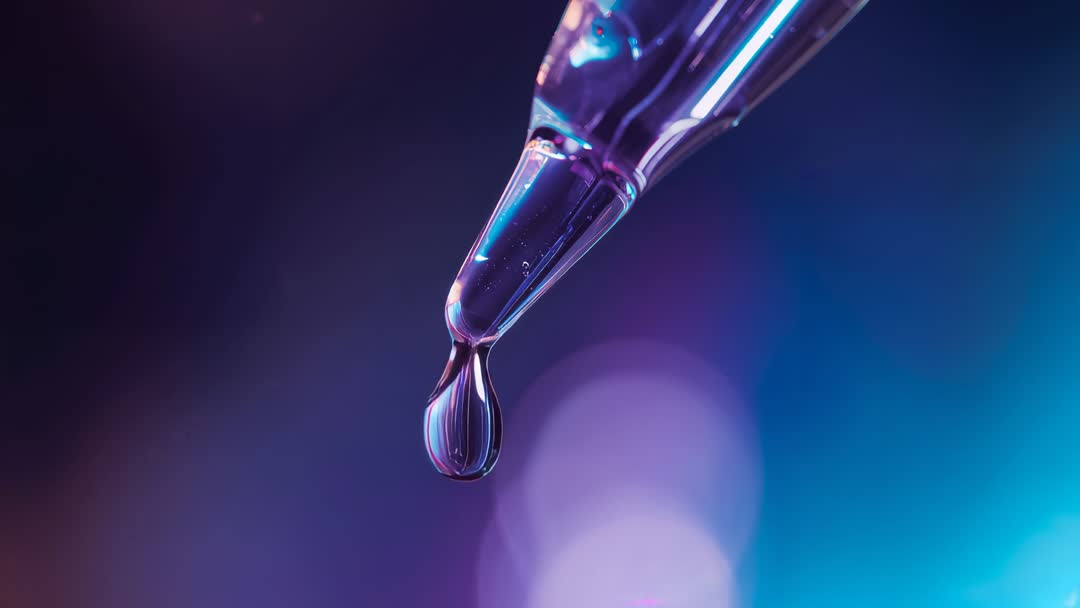 AI Generated Image. Showing macro close-up of glass pipette tip forming bead of liquid and stretching into thin filament before releasing droplet. Featuring purple and blue bokeh highlights and crisp reflections for cinematic, high-contrast look. Emphasizing capillary action, precision pipetting, and delicate sample transfer in laboratory and biotech workflows. Ideal for use in website hero banners, product promos, scientific presentations, training videos, social media campaigns, and packaging design. Providing generous negative space for text or logo overlay and working well with slow-motion sequences or looped backgrounds. Supporting concepts of research, diagnostics, pharmaceutical development, and quality control.