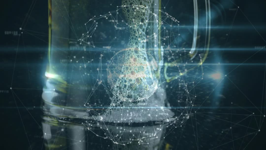 Showing macro slow-motion footage of liquid pouring into glass, forming rising foam column, with holographic network tracking foam growth. Closeup revealing detailed bubbles and froth textures, digital particles and data points orbiting foam, and subtle light streaks creating futuristic mood. Suiting technology commercials, beverage branding, craft brewing promos, brewing process explainers, data visualization backgrounds, science and research presentations, UI hero loops, social media promos, and website banners. Editing tips: loop seamless middle 3 to 6 seconds for repeating backgrounds; color grade toward teal-cyan for cinematic tech mood; crop for vertical 9:16 for reels or square 1:1 for social. Footage mood: futuristic, scientific, experimental, tactile. Use for transitions, title reveal overlays, product packaging concept, or as dynamic background for presentations and promotional content.