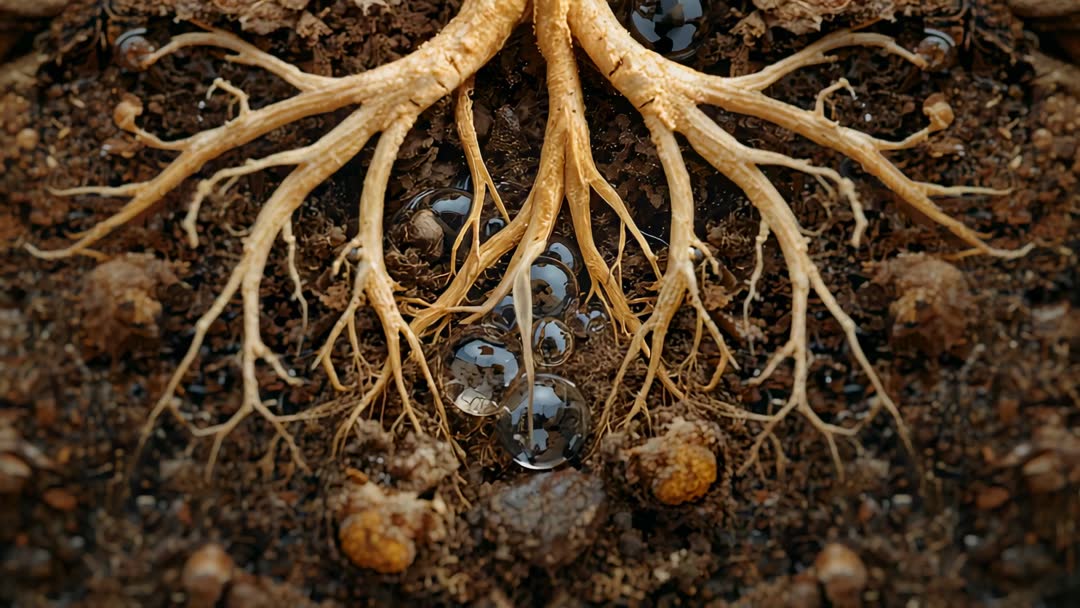 AI Generated Image. Macro video showing root crown hydrating underground as thin water stream merges into glossy droplets nestled in soil. Camera capturing vertical cross-section view of root network, fine root hairs, and soil aggregates interacting with moisture beads. Footage illustrating water movement, root uptake, and rhizosphere dynamics for educational, scientific, and commercial projects. Suitable for irrigation system ads, sustainable agriculture campaigns, botanical research presentations, environmental documentaries, and social media motion content. Footage working well as looping background, explainer clips, timeline sequences, product demonstrations for soil amendments, and digital signage. Close-up macro suitable for slow-motion and frame-by-frame analysis, offering clear visual of capillary action and moisture distribution. Color palette featuring earthy browns and warm root tones, high contrast between glossy droplets and matte soil texture. Contains AI-generated elements for stylized scientific visualization.