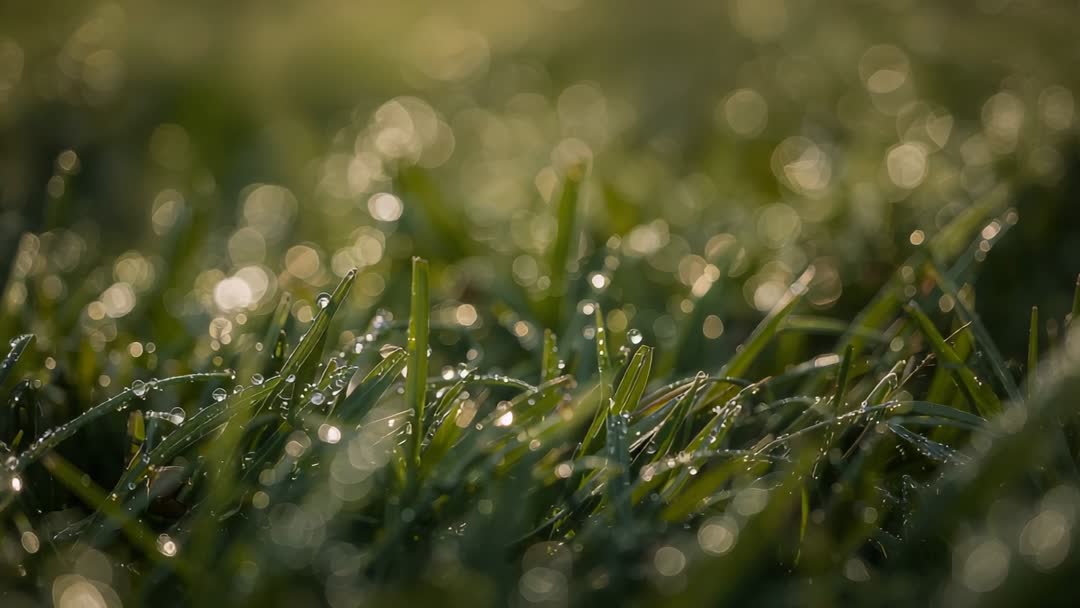 - Macro slow-motion showing dewy lawn blades sparkling at sunrise with golden bokeh