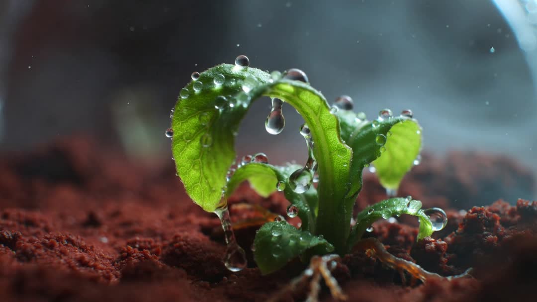 - Macro timelapse showing water droplets forming on green seedling inside terrarium