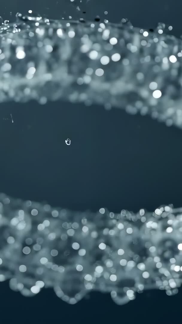 AI Generated Image. Showing gravity pulling single droplets from upper strand into empty center gap framed by out-of-focus bead strands and sparkling bokeh on dark blue backdrop. Useful for adding dramatic looped background to social media reels, creating intro for tech or skincare brands, illustrating fluid dynamics for science or education, pairing with text overlays for minimal product ads, building title backgrounds for vertical mobile apps, and using as texture for motion graphics or VFX. Capture details at high frame rate for smooth slow motion, crop vertically for mobile-first platforms, loop seamless segment for continuous playback, boost highlight contrast to emphasize sparkle, and add subtle ambient water sound for immersive feel. Suitable for advertising, editorial motion pieces, brand presentations, app splash screens, and educational clips about liquid behavior.