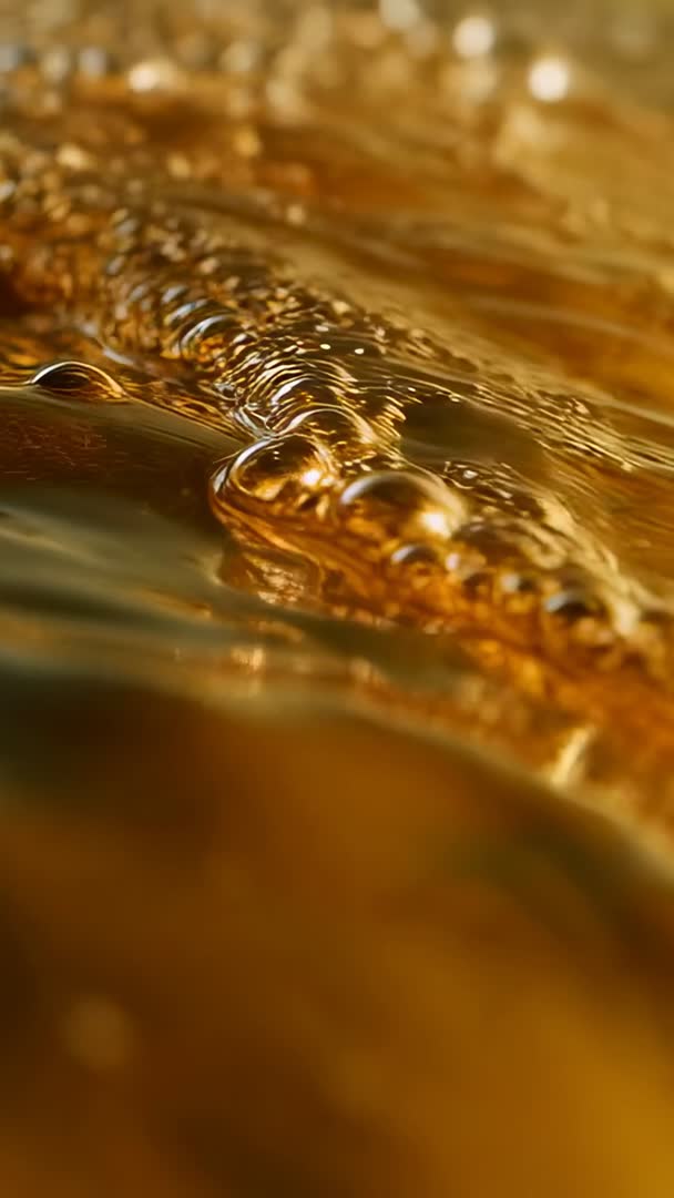 AI Generated Video. Showing macro closeup of amber liquid forming rippling surface and chain of bubbles after droplet impact. Capturing reflective golden tones, soft bokeh highlights, and fluid motion in vertical video format. Featuring slow, cinematic movement suitable for loopable background, motion graphics, or product packaging. Serving as eye-catching hero clip for beverage ads, cocktail tutorials, bar branding, or luxury liquid campaigns. Working well as vertical social media reel, Instagram story, TikTok background, or full-screen website header. Providing high-detail texture for abstract backgrounds, overlays, or transitions in editing projects.