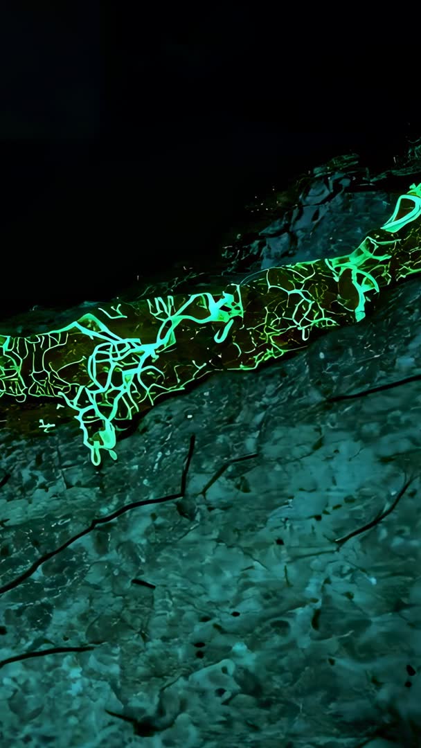 - Macro vertical video of neon green filaments crawling and glowing along cracked rock edge