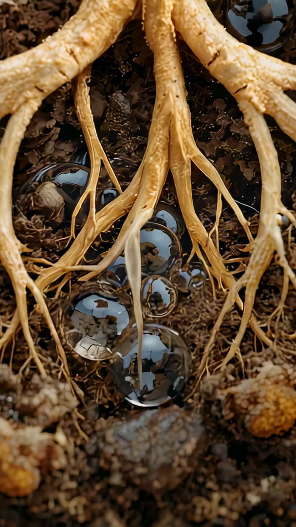 AI Generated Video. Showing oozing sap from plant root filaments contacting and pulling reflective beads buried in soil. Displaying golden root strands curling around glossy beads, forming tiny droplets and stretching substrate. Presenting closeup texture of humus and root hairs, creating dramatic contrast with mirror-like bead surfaces. Supporting educational content illustrating root exudation, capillary action, and plant-soil interactions. Serving commercial uses for gardening product ads, soil amendment marketing, and seed technology promotion. Enhancing editorial pieces on botany, plant physiology, and environmental science. Optimizing for vertical social media reels and stories, short-form science explainers, and background visuals for nature or lab presentations. Recommending slow motion and tight macro crops to emphasize texture and motion, and color grading to boost warm earthy tones.