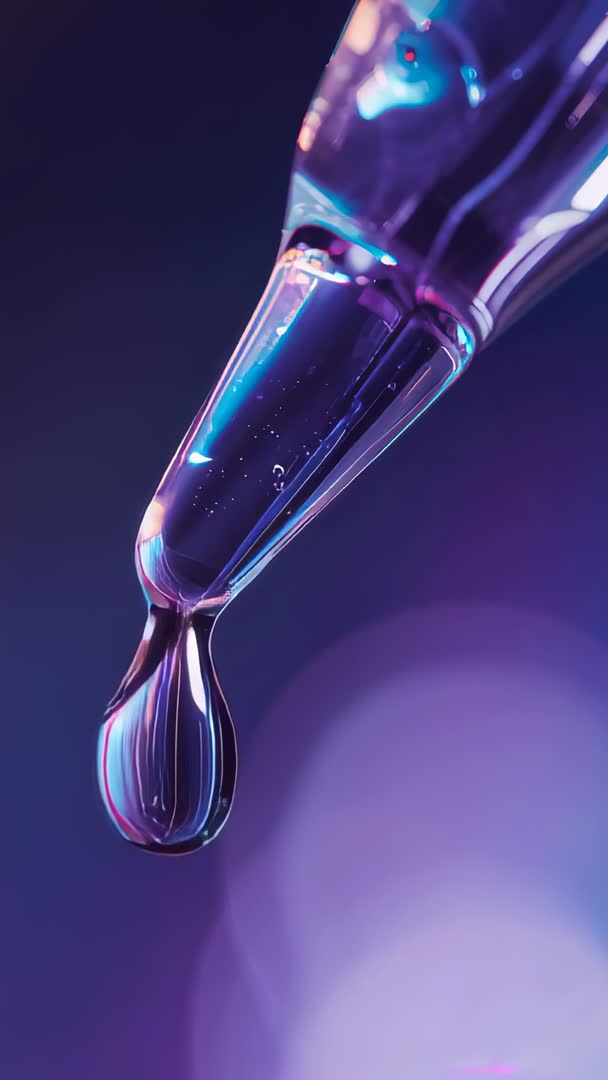 - Macro vertical video pipette releasing clear droplet with purple blue bokeh lighting