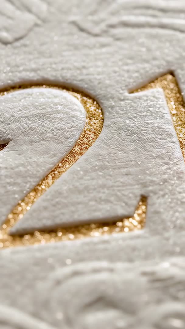 AI Generated Video. Vertical macro video scanning recessed 21 cut into glittering gold foil, catching studio light, producing sparkle and soft bokeh highlights. Tight shallow depth of field revealing textured white surface surrounding digits while gold particles shimmering in engraved channel. Footage suiting luxury branding, anniversary or birthday reveal, event countdown, packaging showcase, title sequence, or social media story ads. Editors using clip for transitions, overlays, or animated reveals in vertical ad formats. Color grading suggestions: enhancing warm tones, increasing highlight contrast, preserving glitter detail. Delivery-ready for vertical platforms, offering cinematic close-up for brand openers, product promos, livestream bumpers, or social reels.