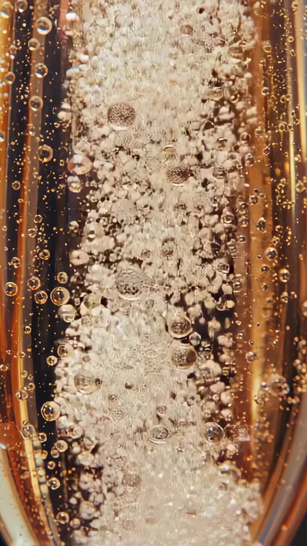 AI Generated Image. Macro vertical video showing nucleation and rising bubbles inside glass vessel filled with golden carbonated liquid. Highlighting fine bubble texture, shimmering light reflections, and dynamic vertical motion for eye-catching close-up storytelling. Working as looping background for social media stories, Instagram Reels, TikTok ads, and mobile-first video campaigns. Supporting product packaging visuals, drink commercials, craft beer or sparkling wine campaigns, and luxury beverage branding. Serving well for scientific or educational sequences explaining nucleation, gas release, and carbonation in liquids. Providing abstract texture and motion for motion graphics, title overlays, and premium website hero sections. Delivering high contrast golden tones and cinematic macro detail for editorial use and advertising.